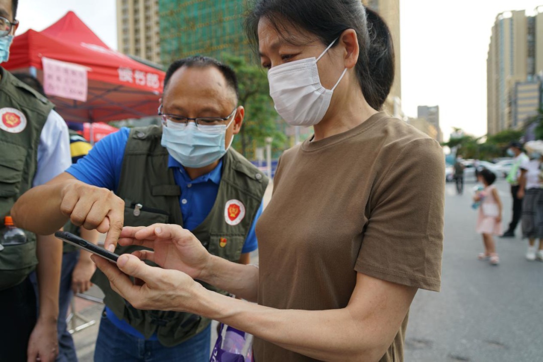 退役軍人志愿者協(xié)助前來進(jìn)行核酸檢測的市民登記信息。(攝影:李盛歡) 退役軍人志愿者們按照分工安排,提供維持秩序、檢查粵康碼、測量體溫、協(xié)助前來檢測的市民登記信息等服務(wù)。在志愿者們的引導(dǎo)下,現(xiàn)場秩序井然,檢測工作快速高效。
