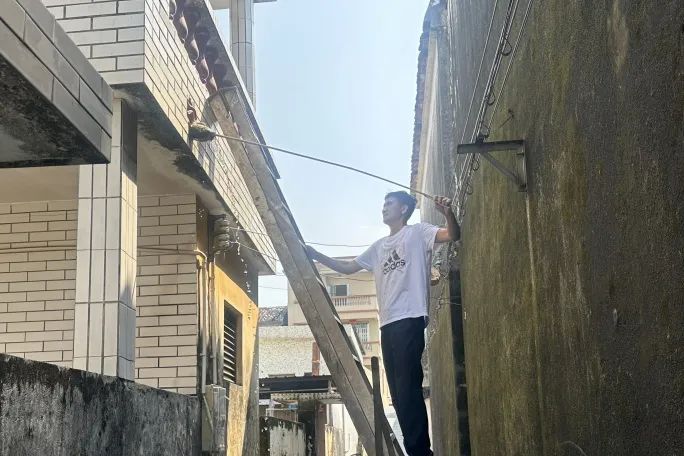 “阿姨,您家樓頂積了水,容易孳生蚊蟲,得趕緊清掉。我們現(xiàn)在先幫您疏通一下排水口?!?在南朗街道蚊媒傳染病防控一線,左步村網(wǎng)格員、退伍軍人嚴兆雄跟村民溝通后,爬上長梯,用工具疏通天臺外墻排水口,讓積水迅速排走,從源頭阻斷蚊蟲孳生。