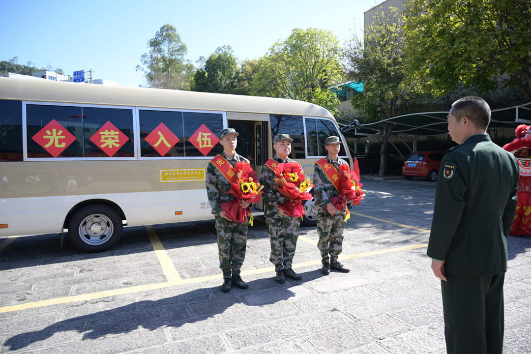 葉陽(yáng)浩、胡家威兩名準(zhǔn)新兵身披“光榮入伍”的紅色綬帶和大紅花昂首挺胸站在太陽(yáng)下,新兵家屬前來(lái)歡送。“陽(yáng)浩的堂叔叔、外公和叔公都曾應(yīng)征入伍,他能進(jìn)部隊(duì)得到鍛煉,我們作為他的父母感到很光榮、很幸福。”葉陽(yáng)浩的父母胸戴“光榮家屬”的大紅花,露出激動(dòng)的笑容。