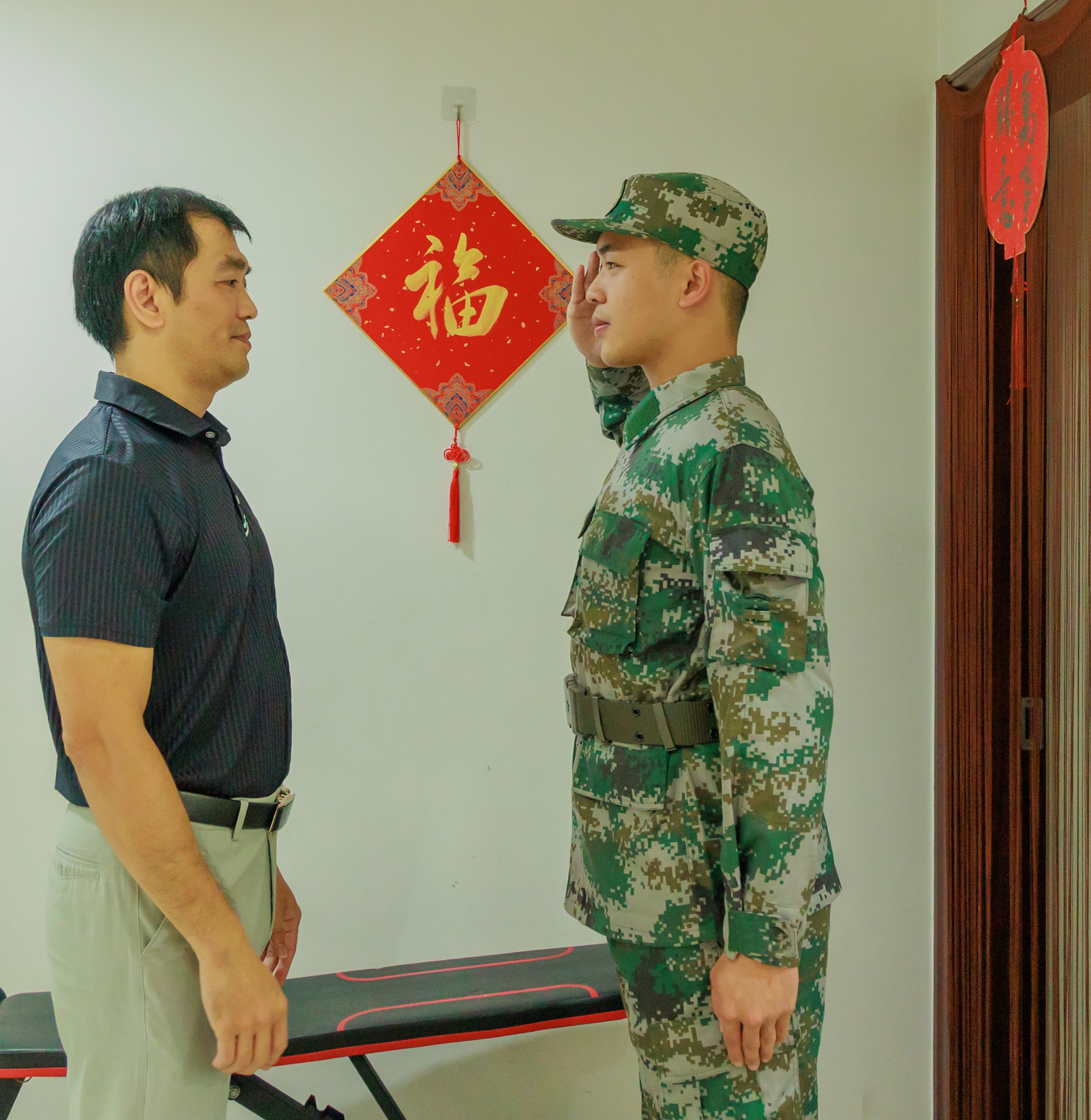 “我將把五彩的夢(mèng)想交給迷彩去儲(chǔ)藏……”9月8日,中山市東區(qū)街道舉行2023年下半年入伍青年歡送座談會(huì),新兵代表?xiàng)钌辛丶?dòng)地說(shuō)。楊尚霖現(xiàn)已領(lǐng)取入伍通知書(shū),并前往中山市國(guó)防教育基地開(kāi)展役前訓(xùn)練,幾天后將啟程前往部隊(duì)服役。 楊尚霖給父親敬禮。馬衛(wèi)星 攝
