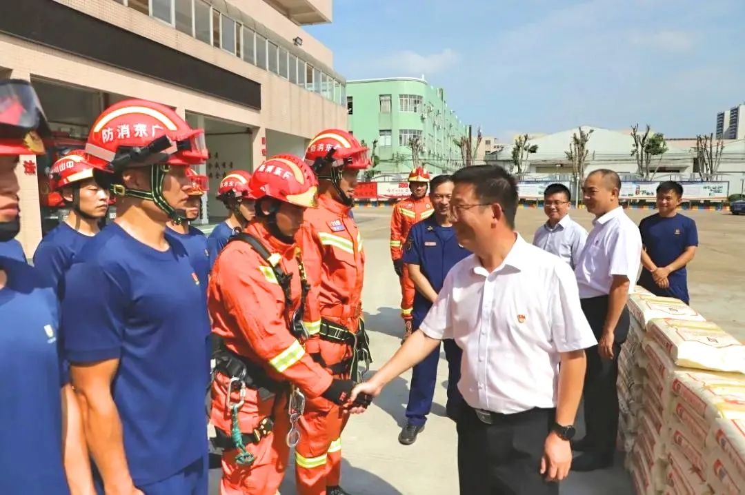 在小欖消防救援大隊(duì),薛治國(guó)與消防指戰(zhàn)員們一一握手,向他們送上節(jié)日的問(wèn)候和慰問(wèn)品,并對(duì)他們的忠誠(chéng)奉獻(xiàn)表示崇高的敬意和衷心的感謝。