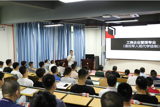 “狹路相逢勇者勝,在座的各位從繁忙的工作崗位上走出來(lái),邁出繼續(xù)學(xué)習(xí)的關(guān)鍵一步,勇氣可嘉。三年后,相信大家一定會(huì)收獲知識(shí)、技能、學(xué)歷,更好地開(kāi)啟新征程。”退役軍人現(xiàn)代學(xué)徒制項(xiàng)目開(kāi)學(xué)典禮上,經(jīng)管學(xué)院院長(zhǎng)肖紅在致辭中對(duì)新生們表示歡迎和祝賀,并表達(dá)了殷切期望,希望大家在求學(xué)期間,修德修身、克勤克儉、心懷理想,腳踏實(shí)地,融入多姿多彩的校園生活,在學(xué)生當(dāng)中彰顯軍人本色和榜樣力量。 市退役軍人事務(wù)局相關(guān)負(fù)責(zé)人對(duì)項(xiàng)目順利開(kāi)班表示祝賀,對(duì)學(xué)院在項(xiàng)目申報(bào)、招生等工作中的辛勤付出表示衷心感謝。他介紹了項(xiàng)目實(shí)施的背景,指出開(kāi)展退役軍人現(xiàn)代學(xué)徒制教育,是退役軍人安置工作的一項(xiàng)重要內(nèi)容,通過(guò)現(xiàn)代學(xué)徒制,讓大家成為全日制大學(xué)生,進(jìn)行正規(guī)系統(tǒng)的高等職業(yè)教育,是黨和政府送給同學(xué)們的一份沉甸甸的“大禮包”。同時(shí),要求新生們盡快適應(yīng)由士兵到大學(xué)生的角色轉(zhuǎn)變,勤學(xué)善思,掌握就業(yè)創(chuàng)業(yè)本領(lǐng),發(fā)揚(yáng)軍隊(duì)能打勝仗的優(yōu)良傳統(tǒng),爭(zhēng)創(chuàng)佳績(jī),為祖國(guó)和地方經(jīng)濟(jì)建設(shè)再立新功。 學(xué)院工商管理專業(yè)主任沈孟康介紹了學(xué)校和學(xué)院概況,就學(xué)生日常管理、教學(xué)內(nèi)容、方式和計(jì)劃等作詳細(xì)說(shuō)明。表示學(xué)校將采取在崗培養(yǎng)與學(xué)校培養(yǎng)相結(jié)合,堅(jiān)持“標(biāo)準(zhǔn)不降、模式多元、學(xué)制靈活”,線上與線下混合教學(xué),實(shí)行工學(xué)交替、靈活多元的教學(xué)模式。經(jīng)管學(xué)院已配備了教授、博士等“精銳”師資團(tuán),“量身定制”人才培養(yǎng)方案,全力保障“八一班”的教育教學(xué)質(zhì)量。