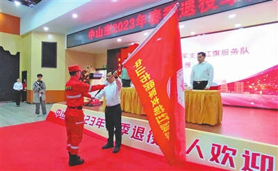 中山市人民政府副市長曾奕給中山市擁軍支前紅旗服務(wù)隊授旗。 楊啟寧 攝