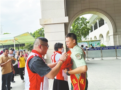 駕駛員伏子陽為一位退役軍人戴上大紅花。受訪者提供