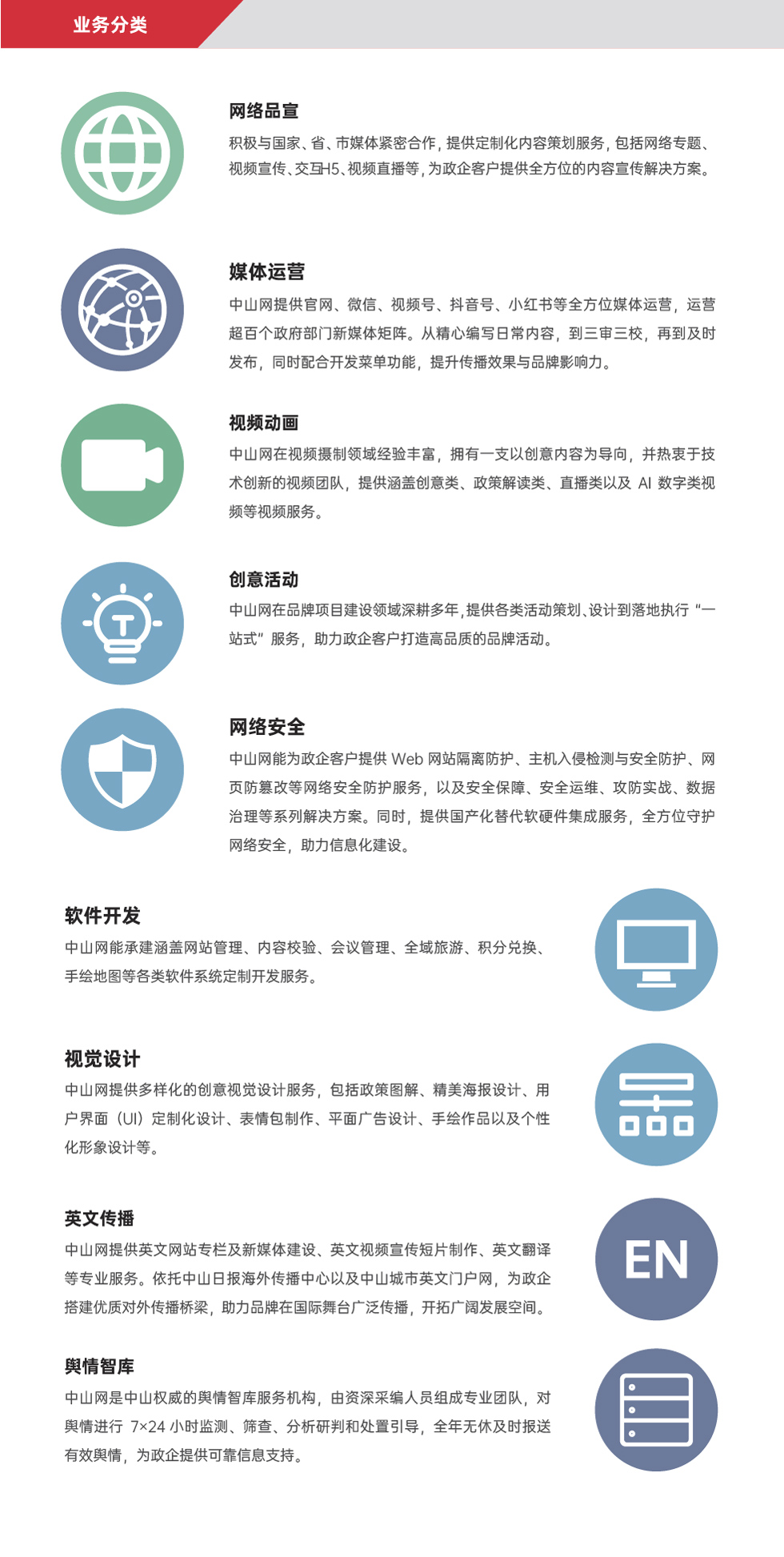 廣東中山網(wǎng)傳媒信息科技有限公司(簡(jiǎn)稱(chēng)中山網(wǎng)信科)是一家以本地新聞門(mén)戶(hù)網(wǎng)站——中山網(wǎng)為平臺(tái),以新聞資訊、視頻動(dòng)畫(huà)、媒體運(yùn)營(yíng)、輿情智庫(kù)、網(wǎng)站建設(shè)及運(yùn)維服務(wù)和網(wǎng)絡(luò)安全技術(shù)服務(wù)為主營(yíng)業(yè)務(wù)的互聯(lián)網(wǎng)綜合信息及技術(shù)服務(wù)運(yùn)營(yíng)商。