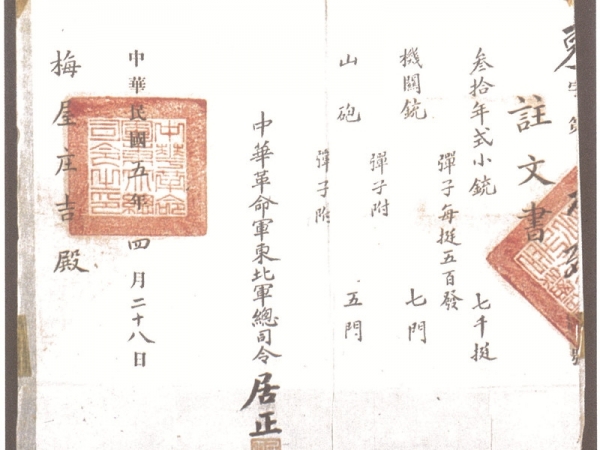 1916年,中華革命軍東北軍總司令居正向梅屋莊吉訂贈(zèng)武器的訂贈(zèng)單