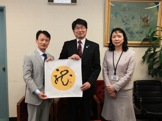 中山市教育考察團成員向田上市長、馬場教育委員長展示中山市小學(xué)生作品