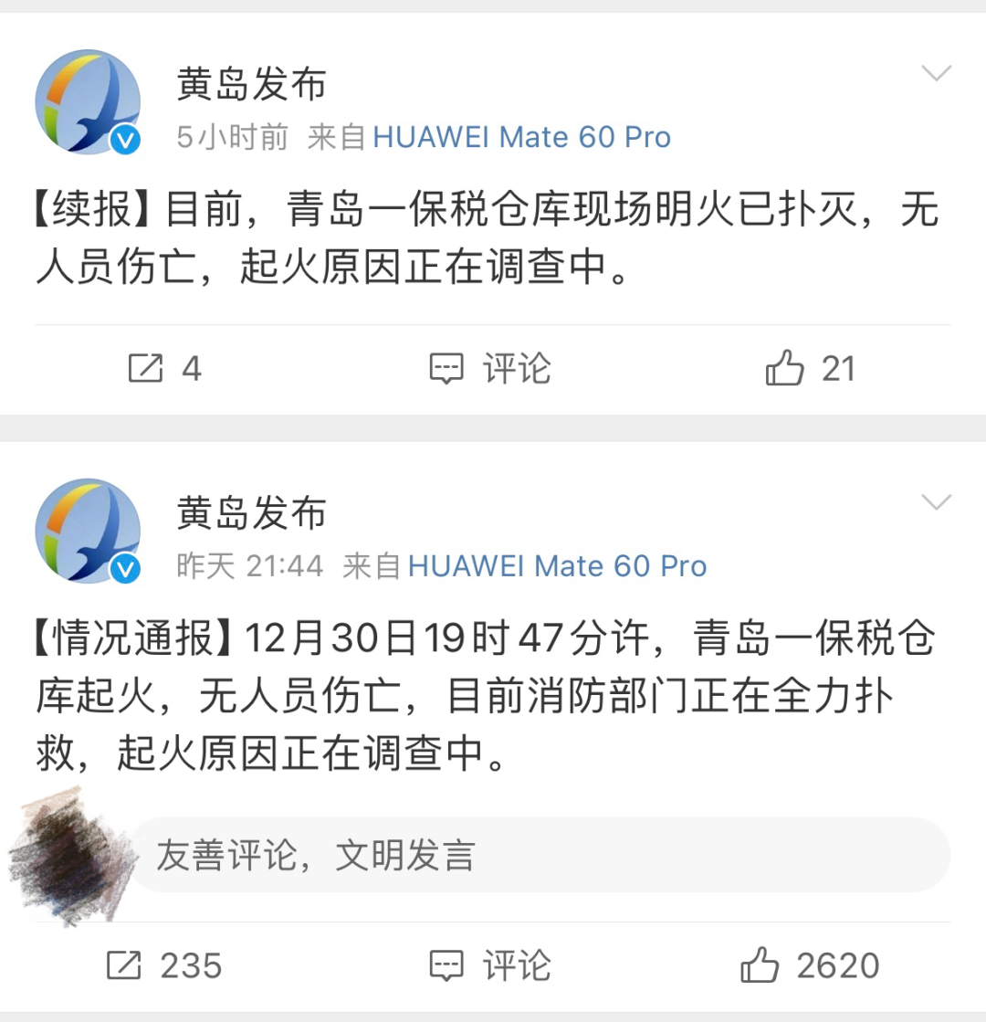 2023年12月30日19時(shí)47分許,青島一保稅倉(cāng)庫(kù)起火,引發(fā)網(wǎng)友關(guān)注。