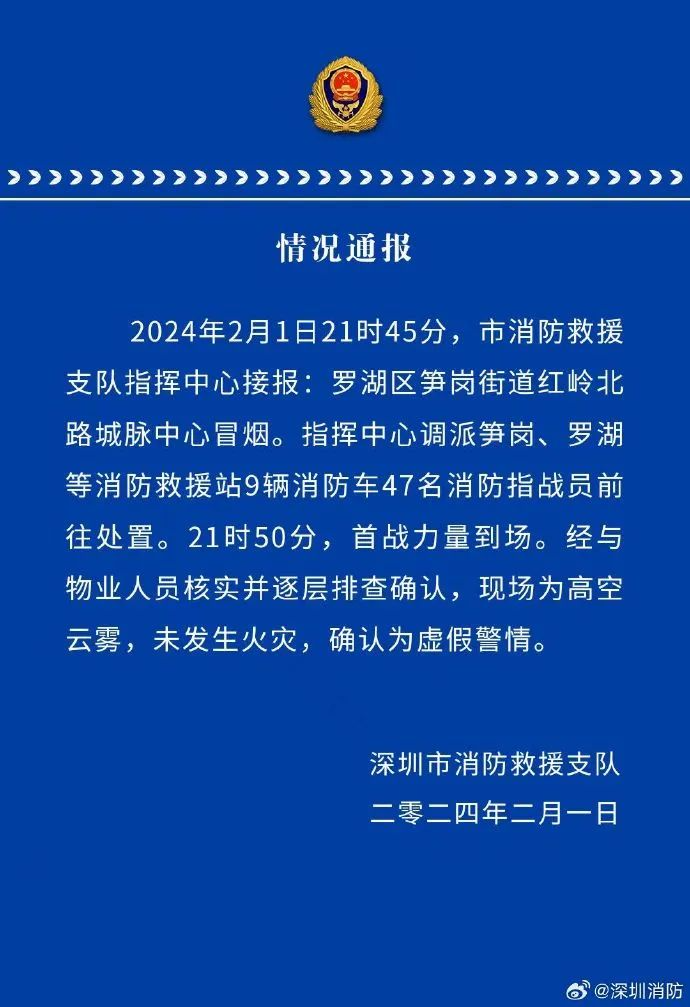 深圳市消防救援支隊指揮中心調(diào)派筍崗、羅湖等消防救援站9輛消防車47名消防指戰(zhàn)員前往處置。21時50分,首戰(zhàn)力量到場。經(jīng)與物業(yè)人員核實并逐層排查確認(rèn),現(xiàn)場為高空云霧,未發(fā)生火災(zāi),確認(rèn)為虛假警情。
