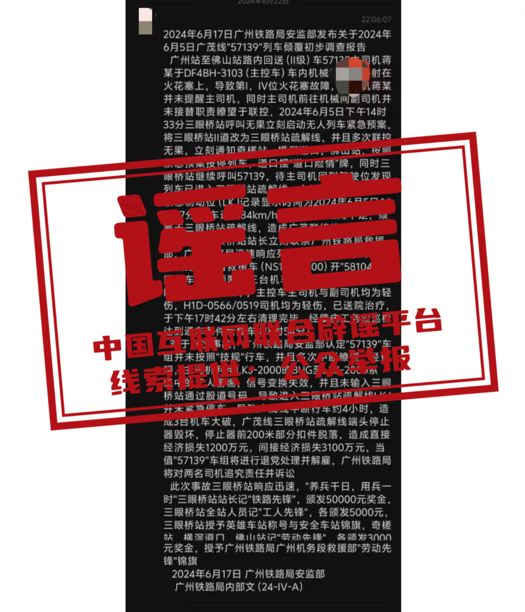 辟 謠 網(wǎng)傳“廣州鐵路局安監(jiān)部2024年6月5日廣茂線57139列車(chē)傾覆初步調(diào)查報(bào)告”為虛假信息