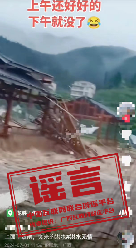 詳情:近日,有網(wǎng)民發(fā)布視頻稱“桂林龍勝一風(fēng)雨橋被洪水沖毀”,并配文“上午還好好的,下午就沒了”,引發(fā)關(guān)注。經(jīng)當(dāng)?shù)毓膊块T核實(shí),偉江鄉(xiāng)轄區(qū)內(nèi)風(fēng)雨橋完好無(wú)損,不存在倒塌的情況。該視頻系當(dāng)?shù)鼐W(wǎng)民龍某某罔顧事實(shí)、故意編造,將網(wǎng)上看到的其他地方的風(fēng)雨橋被毀視頻重新編輯并定位在偉江鄉(xiāng)進(jìn)行發(fā)布。目前,警方已依法對(duì)龍某某予以行政處罰。(來(lái)源:廣西互聯(lián)網(wǎng)辟謠平臺(tái)、龍勝公安)