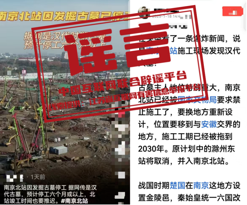 真相:近日,有網(wǎng)民在網(wǎng)絡平臺發(fā)帖稱,南京北站因挖到古墓,“已經(jīng)被國家文物局要求禁止施工了”“預計停工六個月或以上”“施工工期已經(jīng)被拖到2030年”等。經(jīng)江蘇省互聯(lián)網(wǎng)辟謠平臺與省文物部門和屬地核實,目前沒有收到國家文物局關于“南京北站禁止施工”的有關通知,南京北站除個別涉及考古發(fā)掘作業(yè)區(qū)域外,其他施工作業(yè)均按計劃正常有序推進,網(wǎng)傳信息系謠言。(來源:江蘇省互聯(lián)網(wǎng)辟謠平臺、“南京網(wǎng)絡辟謠”微信公眾號)
