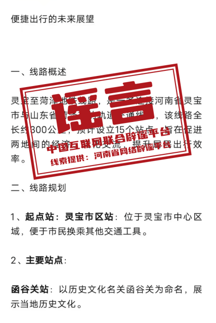 真相:近日,有自媒體賬號(hào)在互聯(lián)網(wǎng)平臺(tái)發(fā)布“靈寶到菏澤的地鐵”相關(guān)信息,稱“該線路全長(zhǎng)約300公里,預(yù)計(jì)設(shè)立15個(gè)站點(diǎn)”“起點(diǎn)站為靈寶市區(qū)站,位于靈寶市中心區(qū)域”,引發(fā)關(guān)注。經(jīng)核實(shí),該消息系虛假信息。互聯(lián)網(wǎng)不是法外之地,請(qǐng)自覺遵守法律法規(guī),不造謠、不信謠、不傳謠。(來源:“清朗河南”微信公眾號(hào)、網(wǎng)信靈寶)