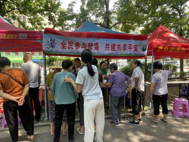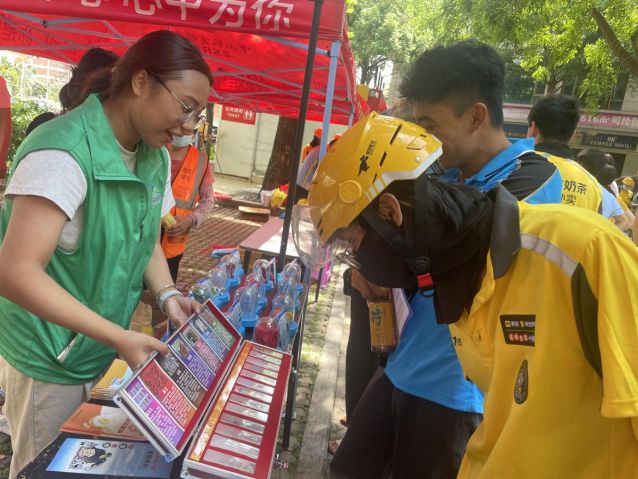 活動伊始,梁主席為活動致辭并給60余名外賣騎手送上夏日清涼飲料及防暑物資,對外賣騎手日常辛苦付出表達(dá)衷心感謝與深情慰問?;顒釉O(shè)置宣傳攤位,外賣騎手與居民群眾駐足攤位前,認(rèn)真聆聽、觀看。禁毒志愿者為大家耐心講解新型毒品的樣式及危害,并結(jié)合騎手配送場景,重點(diǎn)講解“毒駕”危害及可疑包裹識別技巧,強(qiáng)化職業(yè)群體防毒意識,同時(shí)警示騎手嚴(yán)守驗(yàn)視制度,若發(fā)現(xiàn)異常訂單,請立即通過“一鍵報(bào)警”功能舉報(bào),防止涉毒食品或物資流入消費(fèi)者手中,共同筑牢外賣配送禁毒防線。